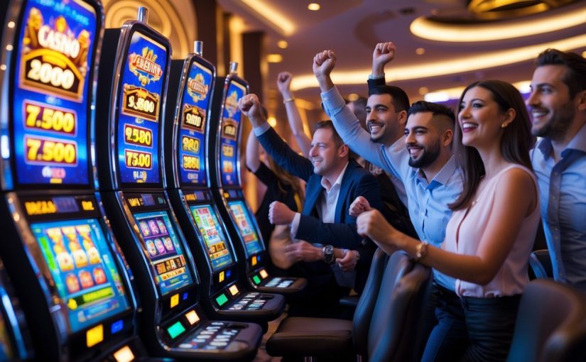 Orang-orang sedang bermain mesin slot di kasino dengan ekspresi senang dan lingkungan yang terang dan mewah.