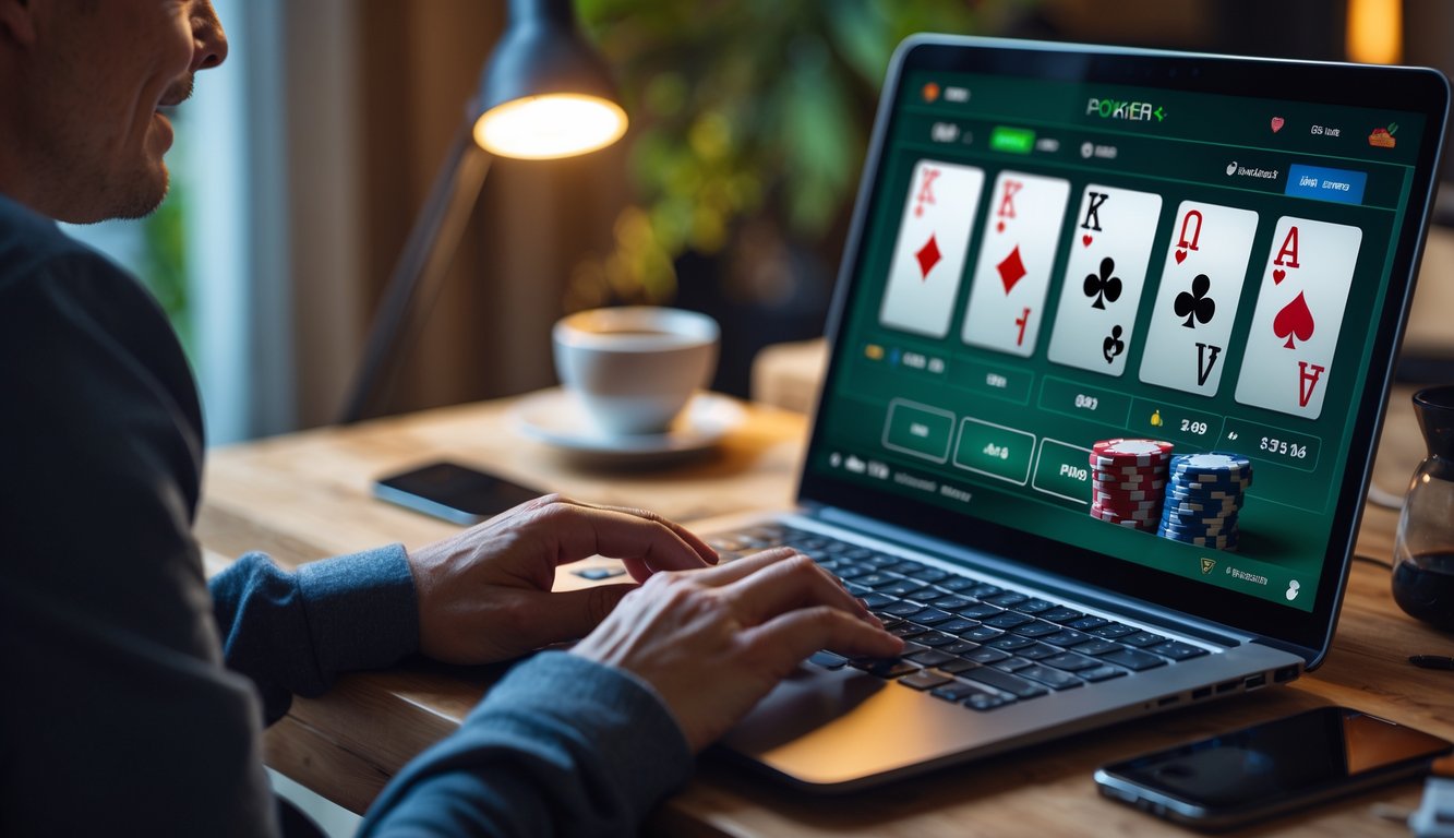Seseorang sedang bermain poker online di laptop di dalam ruangan yang nyaman.